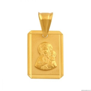 Prostokątny medalik z wizerunkiem Matki Boskiej Częstochowskiej na błyszczącym tle z różnymi grawerami na około. Tył pełny.