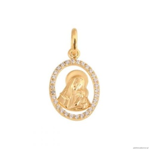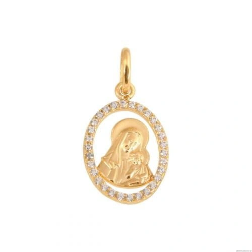 Przestrzenny medalik z wizerunkiem Matki Boskiej z Dzieciątkiem otoczony wianuszkiem cyrkonii.