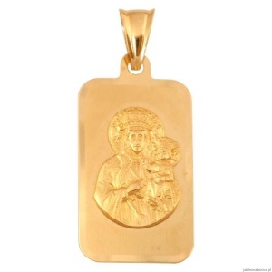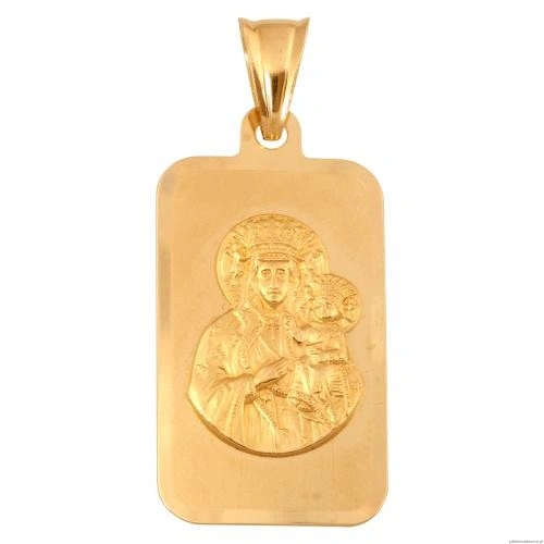 Duży, prostokątny medalik z wizerunkiem Matki Boskiej Częstochowskiej. Tył pełny.