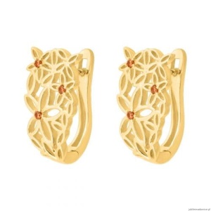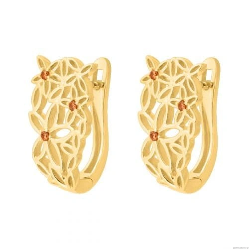 Fantazyjne kolczyki z ażurowym wzorem kwiatów i kamieniami w kolorze szampańskim.