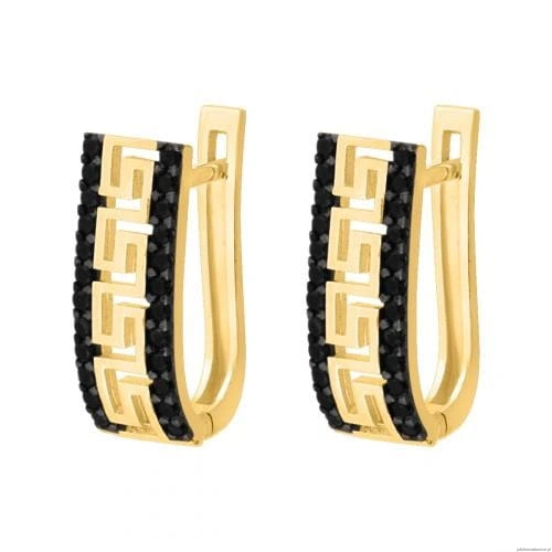 Kolczyki z wzorem greckiej drogi i rzędami czarnych kamieni.