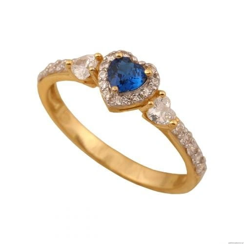 Pierścionek z kamieniem w kolorze szafiru w kształcie serca i małymi cyrkoniami.