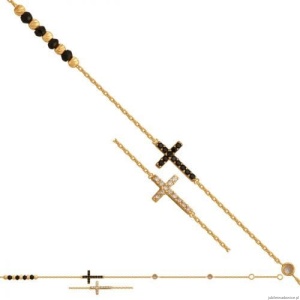 Delikatna bransoletka przewlekana finezyjnymi elementami-krzyżyk dwustronny,kuleczki czarne i złote,oraz dwie cyrkonie.Możliwość regulacji do 17,5cm.