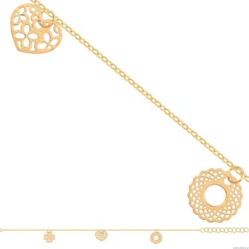 Delikatna bransoletka "celebrytka" z trzema ażurowymi doczepionymi elementami:kółeczko,koniczynka i serduszko.Możliwość regulacji długości do 17cm.