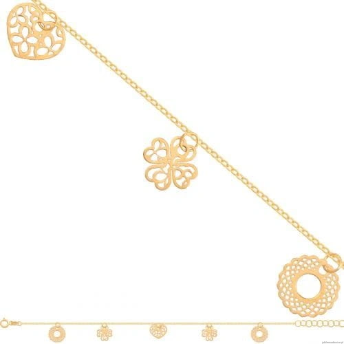 Delikatna bransoletka "celebrytka" z pięcioma,ażurowymi doczepionymi elementami:kółeczka,koniczynki i serduszko.Możliwość regulacji długości do 17cm.