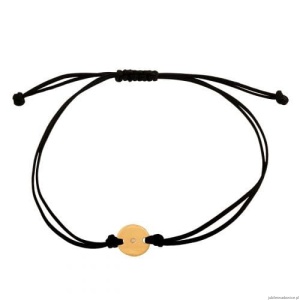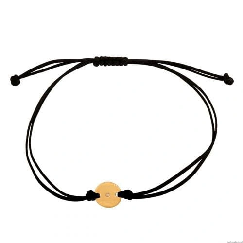 Nowoczesna bransoletka z płaskim kółeczkiem zdobionym cyrkonią na sznureczku CZARNYM.Podana gramatura dotyczy złota.