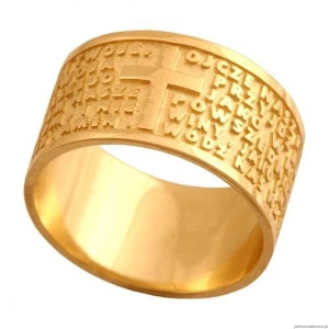 Piękna obrączka z wytłoczoną modlitwą Ojcze Nasz i krzyżykiem.