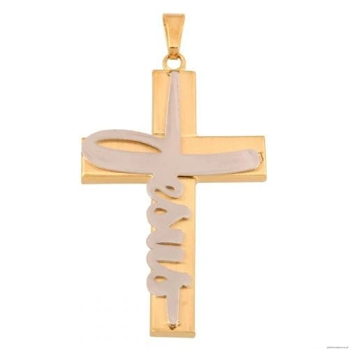 Nowoczesny w formie krzyżyk z napisem "JESUS". Połączenie żółtego i białego złota. Tył pełny.