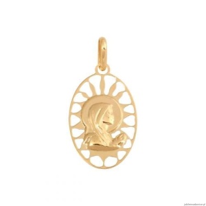 Medalik o nowoczesnej formie z wizerunkiem Matki Boskiej.Wizerunek z tyłu pełny.