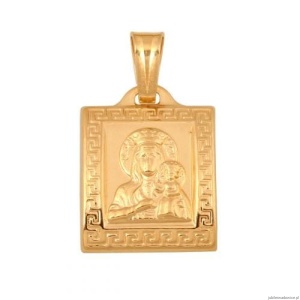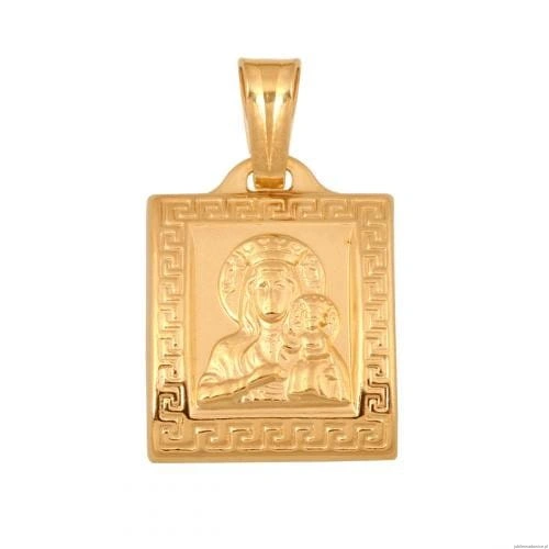 Medalik z wizerunkiem Matki Boskiej Częstochowskiej, otoczony ramką z greckim wzorem. Tył wklęsły.
