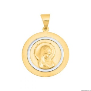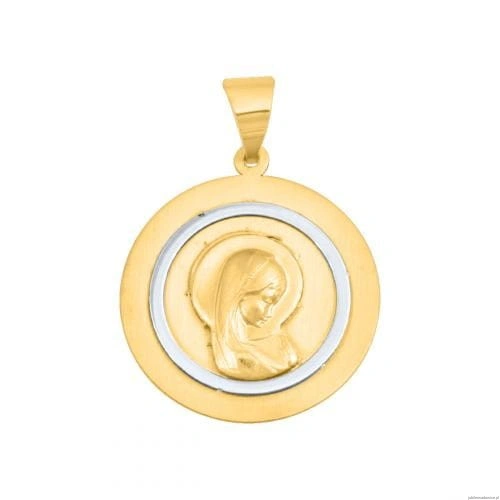 Okrągły medalik o nowoczesnej formie z wizerunkiem Matki Boskiej. Dodatek białego złota i matu.