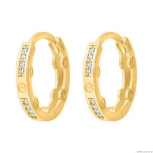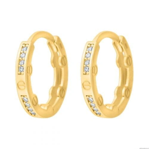 Fantazyjne kółeczka zdobione modnym nacięciem i cyrkoniami. Bok kolczyka o efektownym kształcie z grawerem.