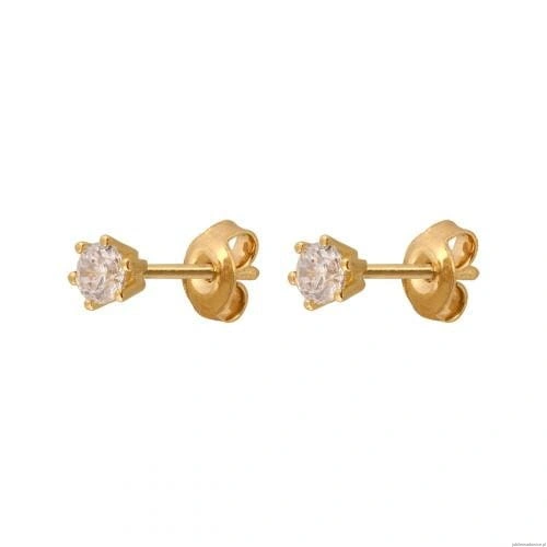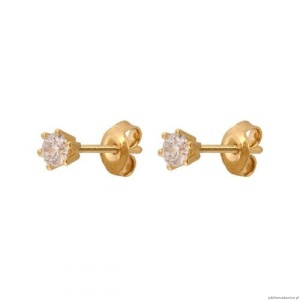 Kolczyki z cyrkonią oprawioną w złoty koszyczek.