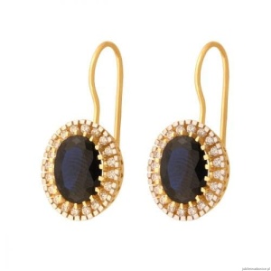 Kolczyki z dużym owalnym kamieniem w kolorze szafiru otoczonym wianuszkiem cyrkonii.