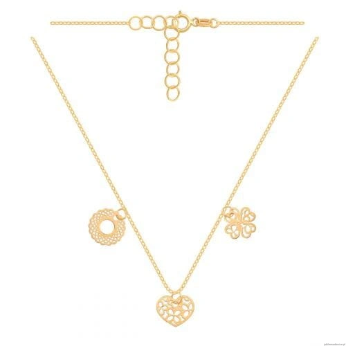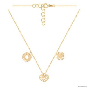 Delikatny naszyjnik "celebrytka" z trzema doczepionymi ażurowymi elementami: kółeczko,koniczynka i serduszko.Możliwość regulacji długości do 42cm.