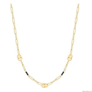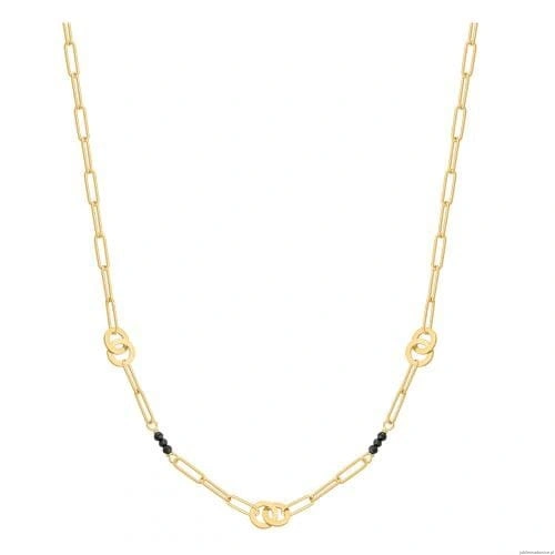Naszyjnik typu claps zdobiony blaszkowymi obrączkami i czarnymi kamieniami.