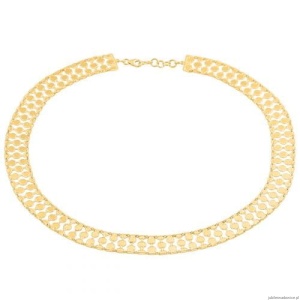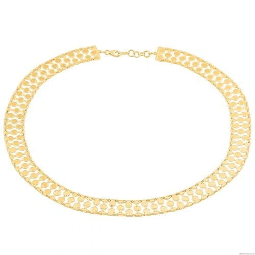 Efektowna kolia z ruchomych, blaszkowych elementów, zdobionych błyszczącymi nacięciami.