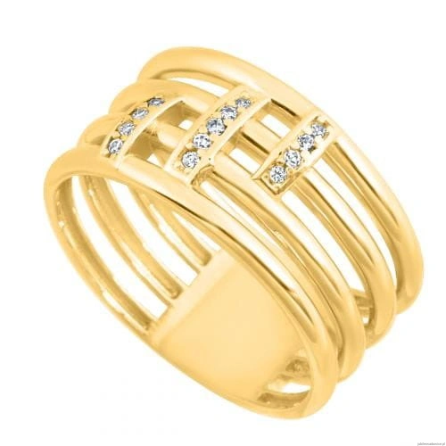 nowoczesny szeroki pierścionek z 4 paseczkami złota i cyrkoniami