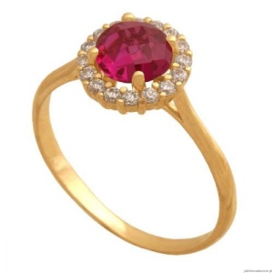 Pierścionek z okrągłym kamieniem w kolorze rubinu,otoczony wianuszkiem cyrkonii.Wymiary dotyczą centralnego kamienia.