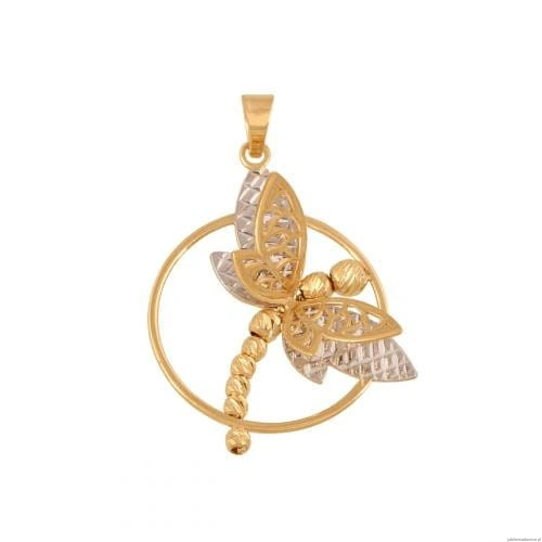 Przestrzenna przywieszka ważka oprawiona w okrągłą ramkę. Połączenie żółtego i białego złota.