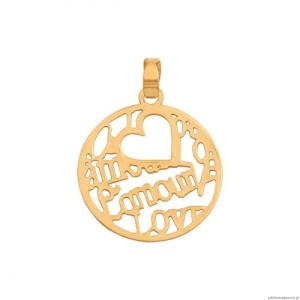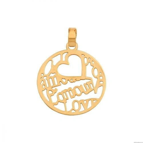 Okrągła,błyszcząca przywieszka z wyciętym serduszkiem i napisami "love","amore" i "lamour".