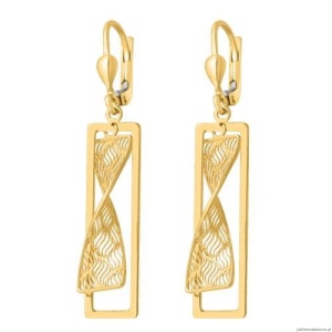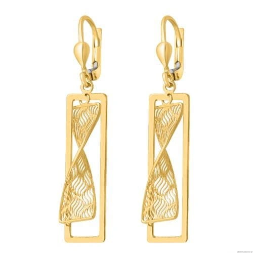 Wiszące kolczyki w formie blaszkowej ramki, wewnątrz ruchomy skręcony, ażurkowy element.