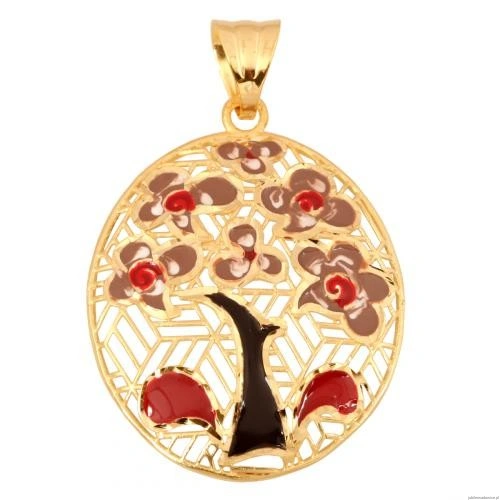 Owalna,wycinana przywieszka z motywem drzewa zdobionego kolorową emalią.Tył wklęsły.
