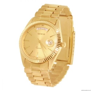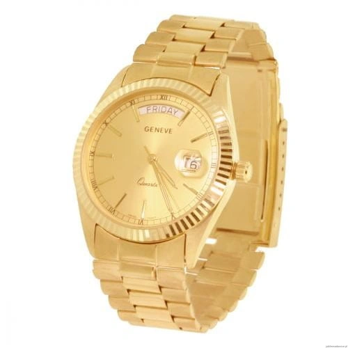 Złoty męski zegarek kwarcowy z datownikiem i dniem tygodnia, bransoleta z regulowaną długością.